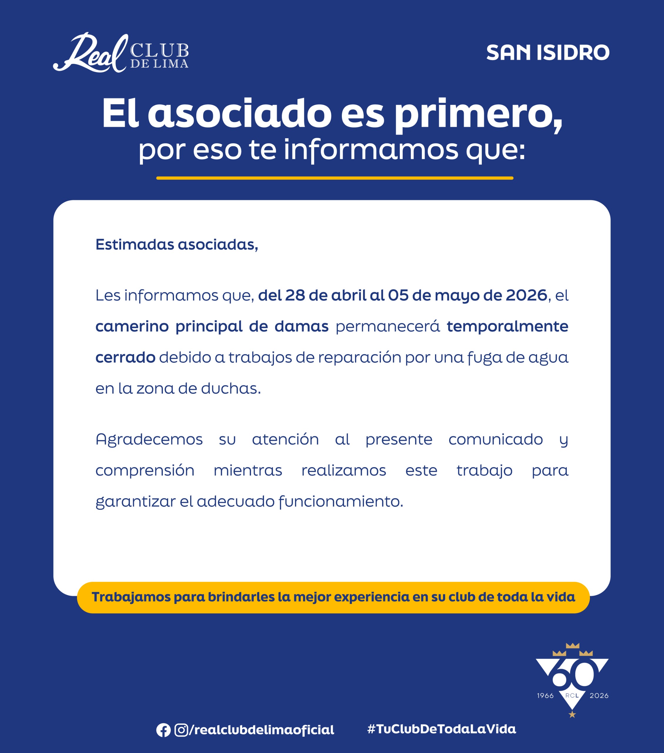Comunicado – Cierre temporal camerino principal de Damas