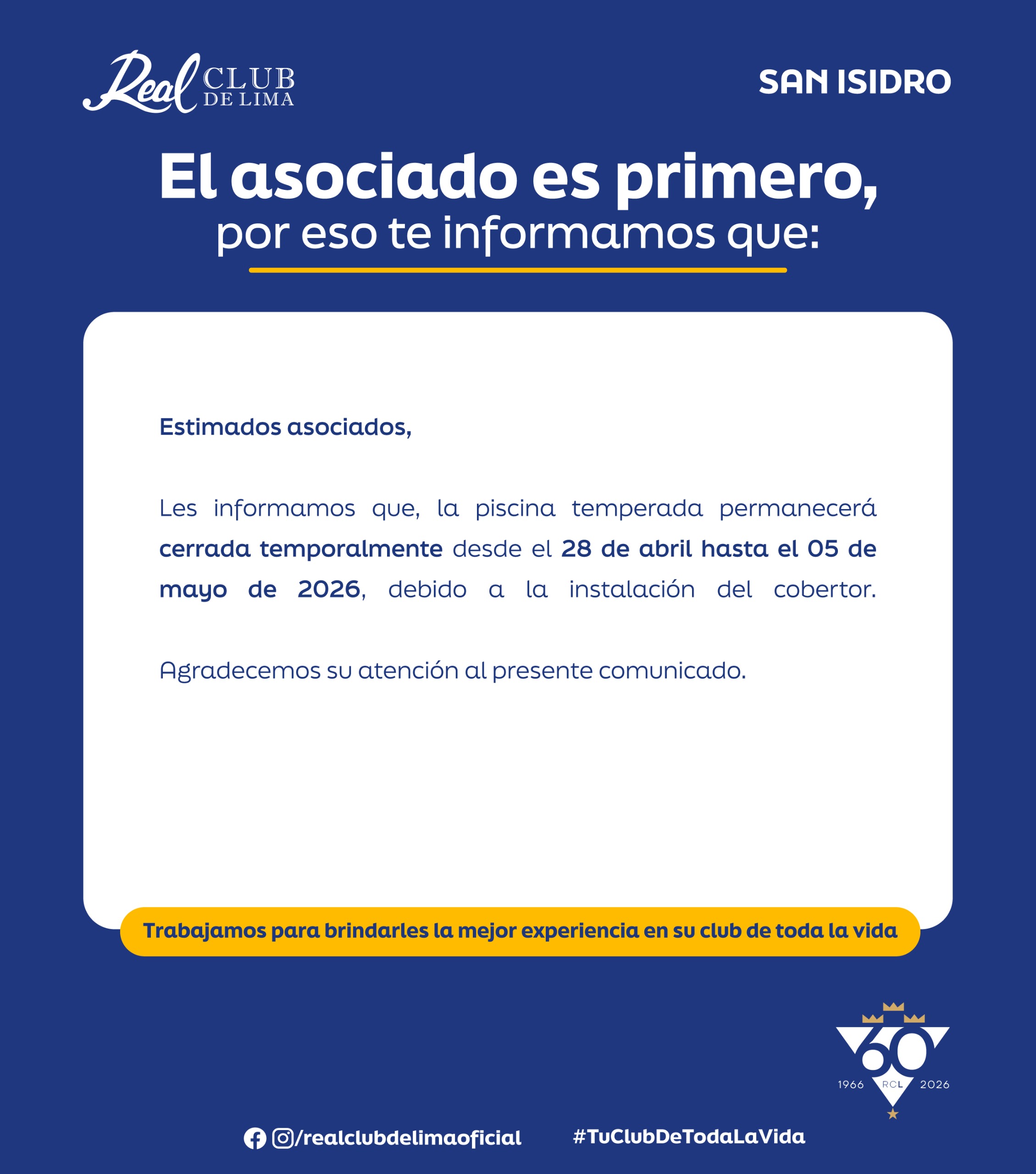 Comunicado – Cierre temporal de la Piscina Temperada
